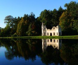 image caption: A peaceful view across the water of Painshill's ruined abbey, courtesy of Fred Holmes, Painshill