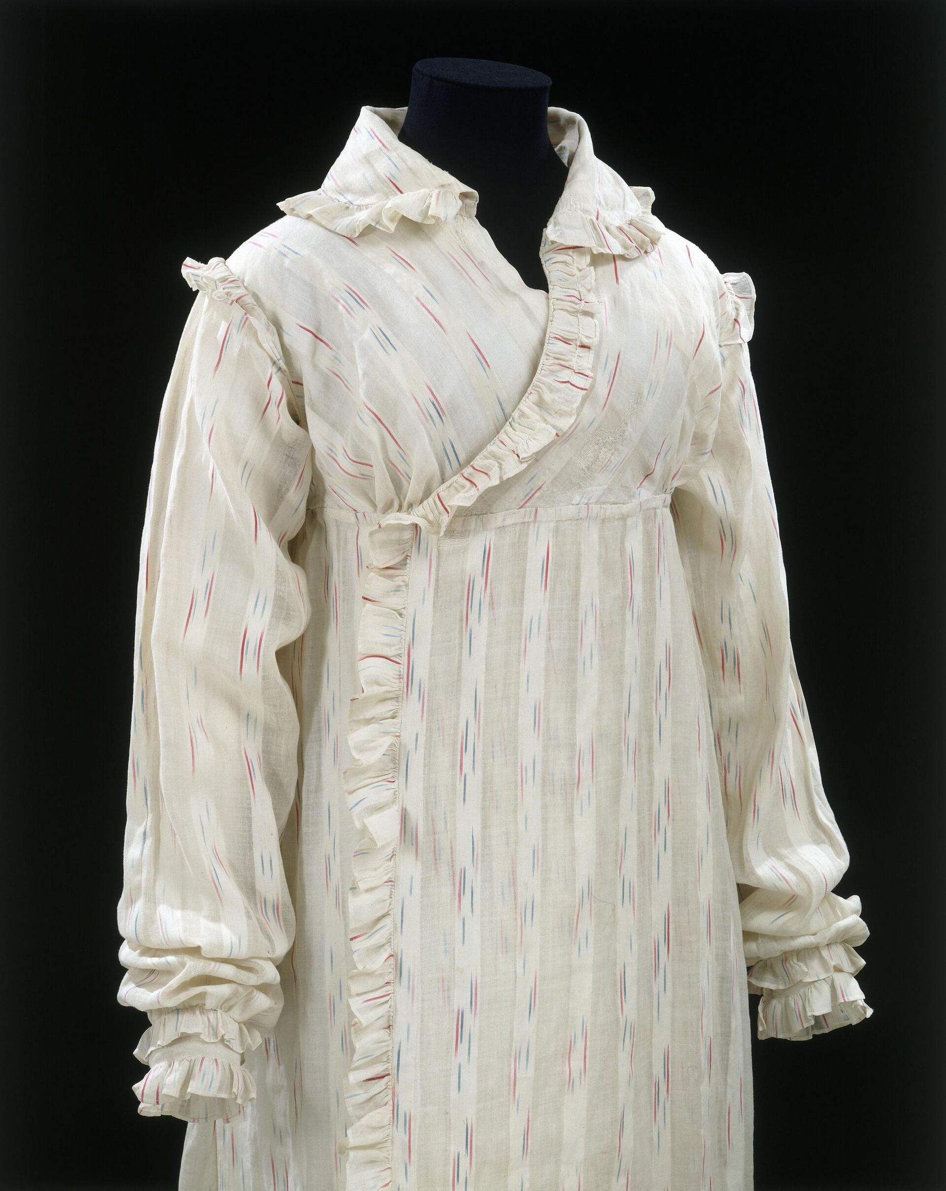 Peignoir, circa 1812-14 Indian ikat dyed muslin, garment made in Great Britain collection of the Victoria & Albert Museum, London, T.798-1913, given by Messrs Harrods Ltd | image supplied and used with permission