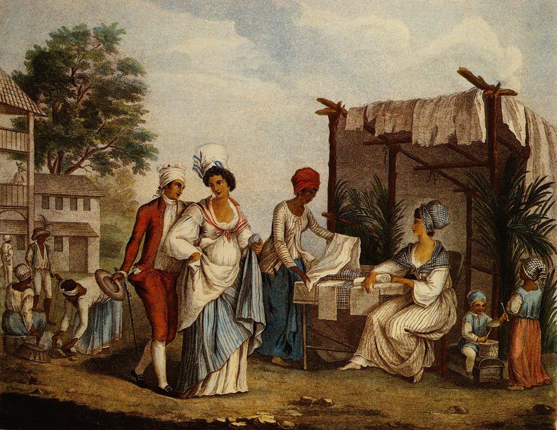 The Linen Market at St. Domingo. Engraved print of painting by Agostino Brunias, published by John P. Thompson (London), October 6, 1804.