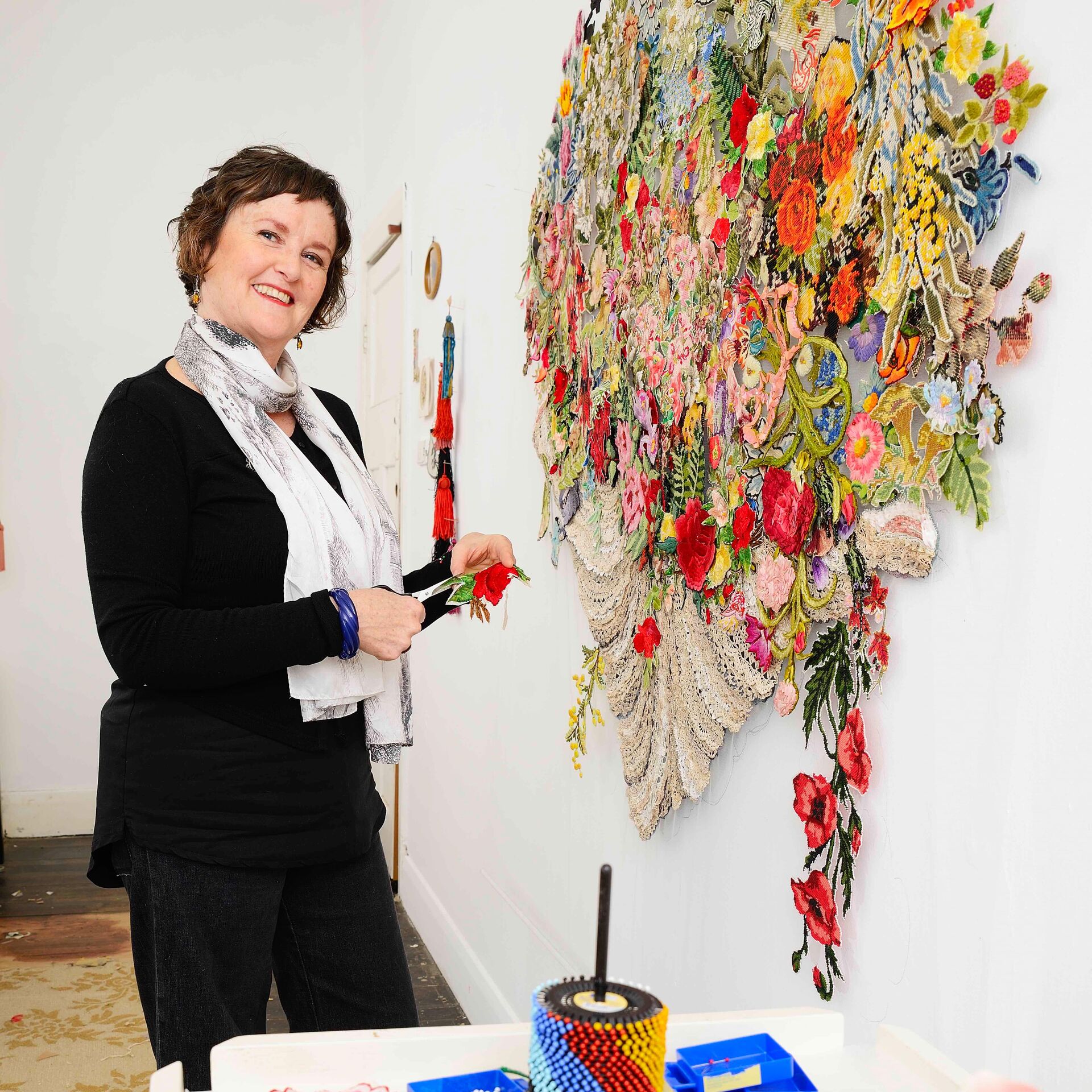 Louise Saxton is a Melbourne-based artist. She has made seven large bodies of work from reclaimed textiles, including her major installations: Sanctuary at Heide Museum of Modern Art in 2012 and The Linen Project at Hawthorn Town Hall Gallery in 2018. She has held three solo exhibitions with Gould Galleries (now Gould Creative) and exhibited widely in Australia and overseas. Her work is held in private and public collections in Australia, Malaysia, India and the USA. For more information see: www.louisesaxton.com/about