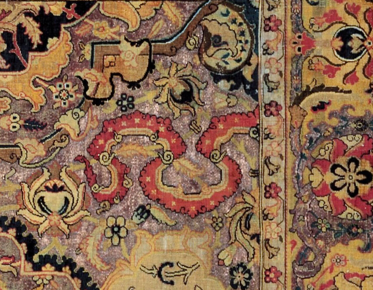 image caption | detail of the Yakob AGSA 'Polonaise' carpet, Iran, Isfahan Province, circa 1625-30, cotton (warp and weft), silk (weft and pile), metal wrapped thread; asymmetrically knotted pile, brocade | 266.5 x 164.0 cm, collection of the Art Gallery of South Australia, Adelaide, 20004A179, gift of William Bowmore AO OBE through the Art Gallery of South Australia Foundation 2000, Public Domain