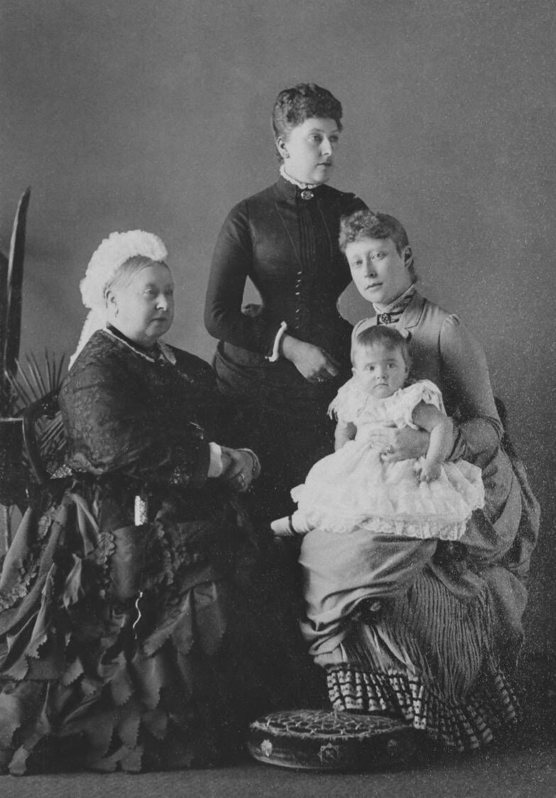 Gustav Mullins (1854-1921). Queen Victoria, with her daughter Beatrice, Princess of Battenberg, her grand-daughter Victoria, Princess of Battenberg, and her great-grand-daughter, Princess Alice of Battenberg (mother of Prince Philip). 1886. Albumen Print. Collection of HM Queen Elizabeth II.