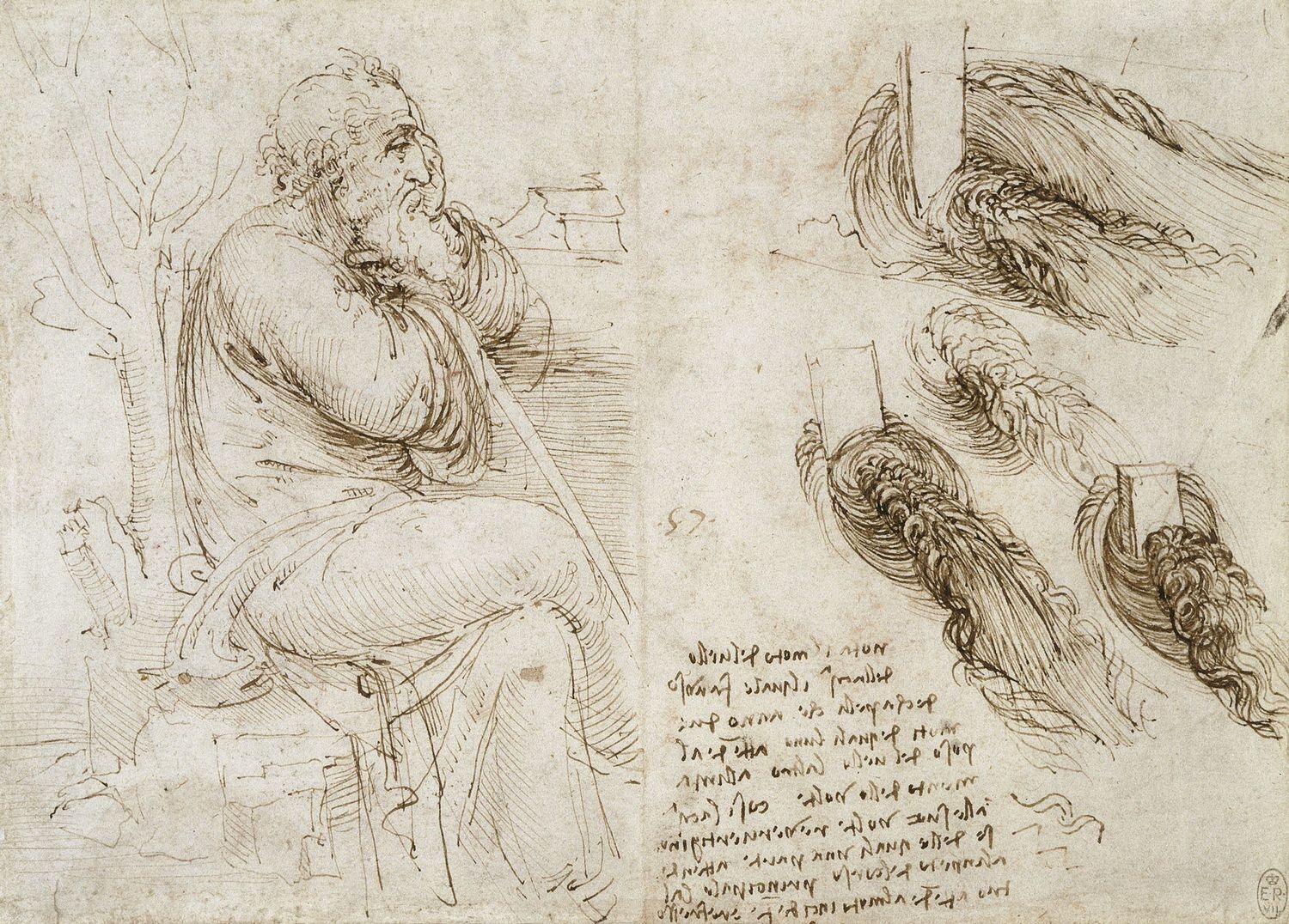 Recto: A seated old man, and studies and notes on the movement of water. Verso: Architectural studies, circa 1510Recto: Pen and ink. Verso: Red chalk | 154 x 217 mm (sheet of paper)The Royal Collection, England, RCIN 912579, Royal Collection Trust / ©Her Majesty Queen Elizabeth II 2018 | Public Domain