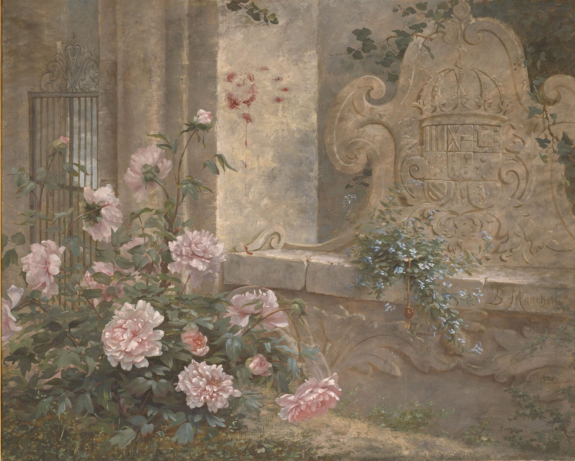 Patronised by Lady Loch, Mouchette frequently exhibited and developed a method of painting on canvas to imitate tapestry. Her sister Marie Lion was an accomplished miniature painter and French language teacher and they often worked together. Arriving in Melbourne from Paris in 1881, Mouchette made East Melbourne the place for her first residence and studio.